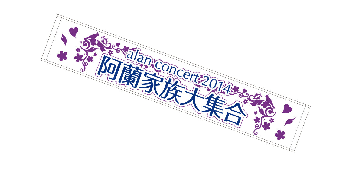 白地のタオルにalan concert 2014 阿蘭家族大集合のコンサートロゴがブルーとパープルでプリントされたデザイン。